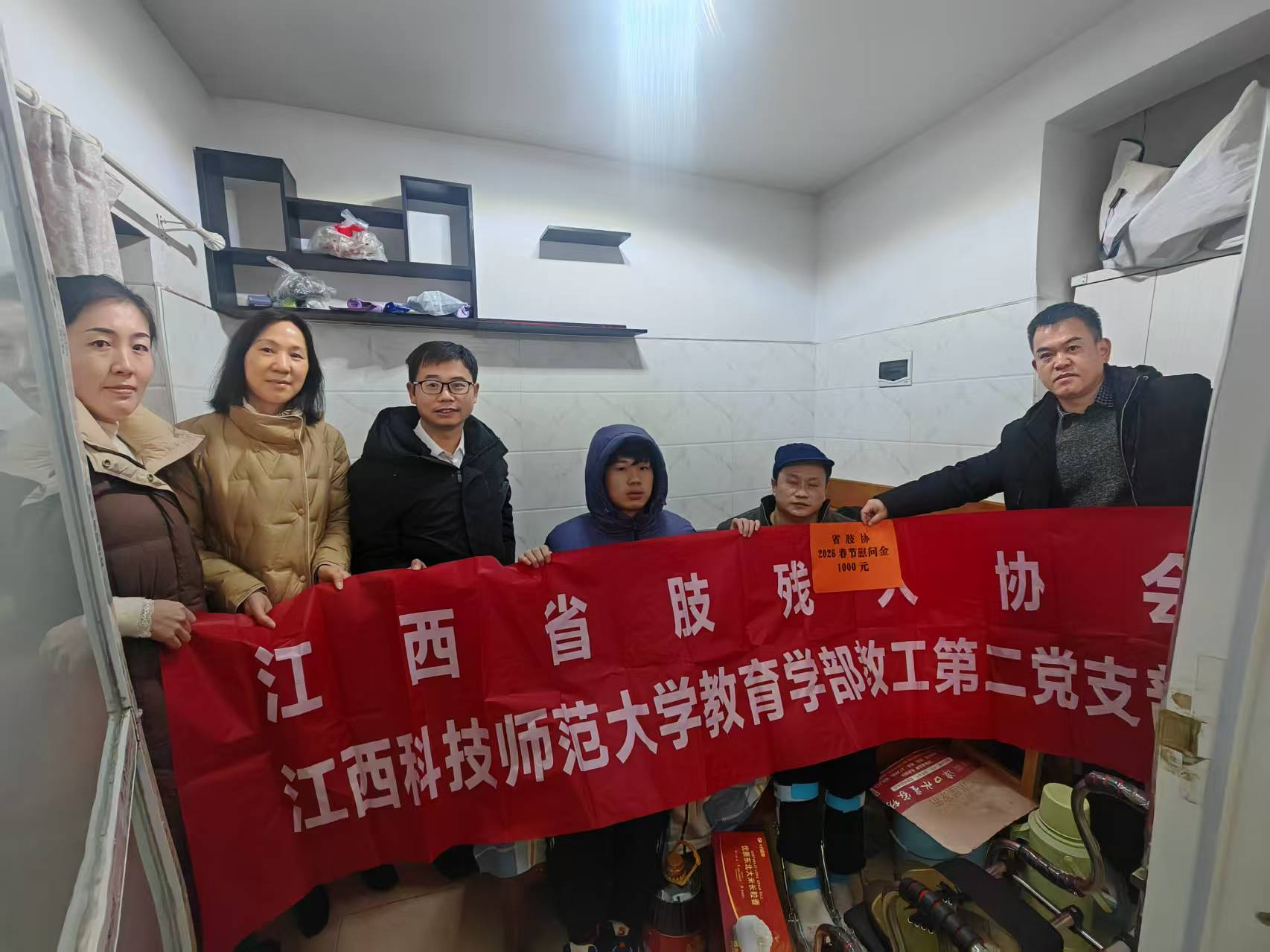 近日,教育学部教工第二支部党员肖称萍、陶军明、秦红梅、教工支部书记刘佩佩,以及江西省肢残人协会主席吴启琳一行,专程走访慰问了2025级机械设计制造及其自动化专业新生刘宏基及其父亲,为他们送去物资和慰问金。